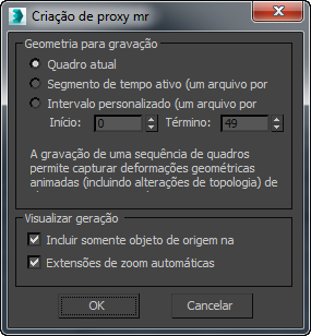 Na caixa de diálogo Criação de Proxy mr, selecione uma opção de animação (Segmento de tempo ativo ou Intervalo personalizado) e, se desejar, alterne entre as opções de Visualizar geração. Clique em OK para continuar.