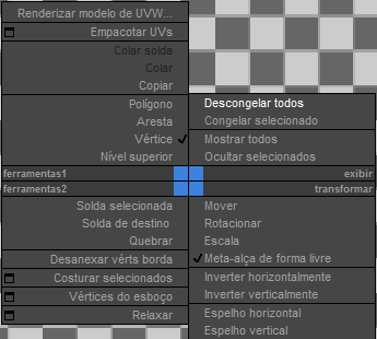 A barra de menus fornece acesso a uma ampla gama de funções de Editar UVWs. Consulte a Barra de menus da caixa de diálogo Editar UVWs.