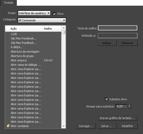O painel Teclado permite criar seus próprios atalhos de teclado. É possível atribuir atalhos à maioria dos comandos disponíveis no 3ds Max.