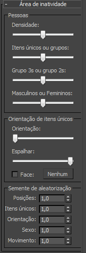 Em Preencher, uma área inativa é uma superfície em que pessoas simuladas "passeiam" sozinhas ou interagem com outras. Os recursos visíveis incluem círculos que mostram grupos de pessoas conversando e marcadores que mostra a posição de cada personagem, orientação inicial e sexo: vermelho para feminino e azul para masculino.