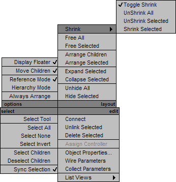 Exibe todos os nós na cena. Se a Vista Esquemática resultante estiver muito confusa para se trabalhar, experimente utilizar as Preferências para remover o que você não precisa ver. Opcionalmente, faça seleções individuais e oculte no sentido crescente ou descendente para desconfundir a exibição.