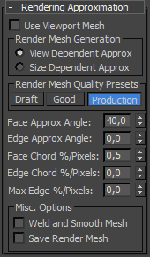 Selecione uma configuração geral que determina automaticamente o resto das configurações de Aproximação de renderização. A opção padrão, Produção, proporciona uma alta qualidade de renderização sem artefatos poligonais na maior parte do tempo. Ocasionalmente poderá ser necessário fazer outros ajustes.