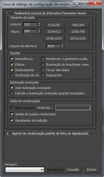 A caixa de diálogo Configuração de renderização do exportador de panorama é uma versão modal da caixa de diálogo Configuração de renderização especialmente configurada para gerar saídas panorâmicas.