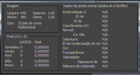 - O valor gama suportado no arquivo de bitmap. Este valor é sempre 1,0, pois quando a imagem é renderizada e salva na memória ou em um arquivo, não é aplicada nenhuma correção. É possível ver o valor gama usado para exibir a imagem, se houver, na barra de título da Janela do quadro renderizado.