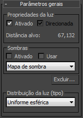 Esta implementação de Parâmetros Gerais é exibida para luzes fotométricas. Estes controles ativam uma luz e excluem ou incluem objetos na cena. Eles também permitem definir o tipo de distribuição de luz.