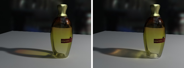 Na ilustração a seguir, o lado esquerdo mostra o resultado com uso de sombras transparentes escolhido, e o lado direito exibe o resultado com os efeitos Refratar Luz e Gerar Caustic escolhido. É possível combinar livremente dois modos na mesma renderização. Fótons são automaticamente tratados de acordo com o tratamento interna de protetor de fóton, passagem direta de luz no primeiro caso e sendo refratado como caustics no último.