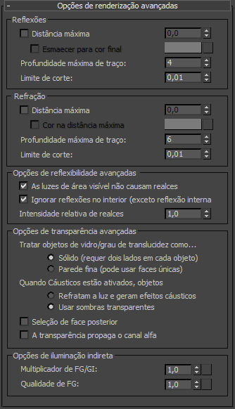 - A maioria das reflexões dentro de objetos transparentes são muito fracas, exceto no caso especial conhecido como reflexão interna total(TIR), que ocorre em determinados ângulos. Quando ativada, esta opção economiza o tempo de renderização por ignorar as reflexões fracas completamente mas mantendo a TIRs. Padrão=ativado.