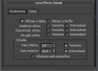 A Oclusão é utilizada para determinar quando um Efeito de Lente será afetado por um objeto que vem entre o efeito e a câmera. Usando dois controles giratórios para determinar a oclusão, você pode fazer com que objetos de cena realisticamente afetem a aparência de seu efeito. O raio externo irá determinar quando outro objeto de cena irá iniciar a oclusão e o raio interno irá determinar quando o objeto de cena fará com que o efeito alcance a oclusão máxima.
