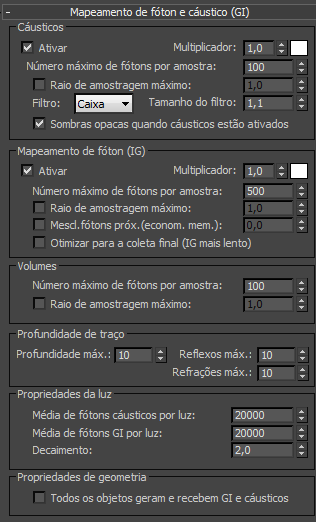 - Define o número de fótons emitidos por cada luz para uso em produtos cáusticos. Este é o número de fótons no mapa de fóton utilizado para produtos cáusticos. Aumentar este valor aumenta a precisão dos produtos cáusticos, mas também aumenta a quantidade de memória usada e a duração do tempo de renderização. Diminuir este valor melhora o uso da memória e do tempo de renderização, e pode ser útil para visualizar os efeitos de produtos cáusticos. padrão=10000.