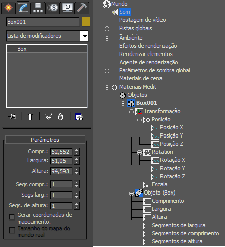 Parâmetros de criação do objeto no painel Modificar e Track View