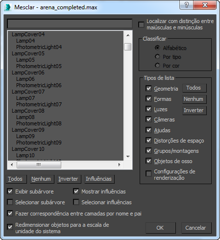 Mesclar. A caixa de diálogo Mesclar é exibida, mostrando todos os componentes na cena.