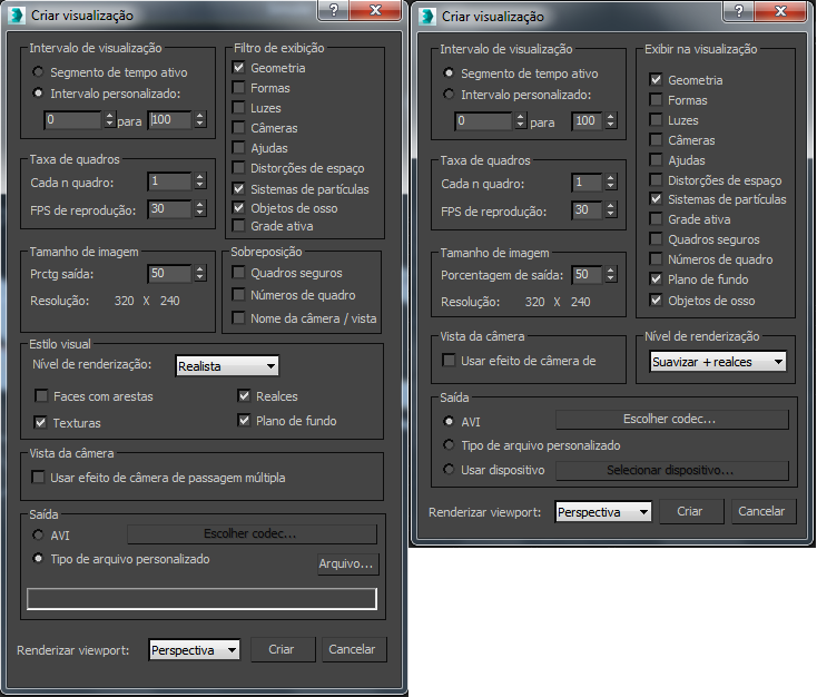 A caixa de diálogo Criar visualização permite criar um arquivo AVI ou um tipo de arquivo personalizado da animação na viewport ativa. Também é possível renderizar uma visualização para um dispositivo especificado.