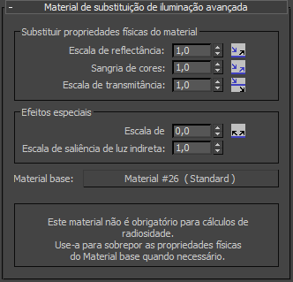 Este material permite controlar diretamente as propriedades de radiosidade de um material. A opção Substituição de Iluminação Avançada é sempre um suplemento de um material de base, que pode ser qualquer material renderizável. O material de Substituição de Iluminação Avançada não tem nenhum efeito em renderizações comuns. Ele afeta a solução de radiosidade ou o rastreamento de luz.