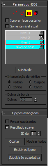 Mostra o nível atual da hierarquia de subdivisão. É incrementado automaticamente quando você subdivide uma seleção de subobjeto. Para editar em um nível de detalhe diferente, selecione o nível na pilha. O nível atual é contornado em vermelho.