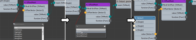 A outra entrada do nó OffsetMesh (conector laranja) é OffsetVector, que permite especificar o deslocamento do objeto em três dimensões e, portanto, requer um tipo de entrada Vector3. Na próxima etapa, será possível utilizar um recurso conveniente para adicionar o nó necessário, sem ter que encontrá-lo na lista Nós de operador.