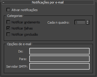 - Envie e-mails para indicar o andamento da renderização. Uma mensagem de e-mail é enviada sempre que o número de quadros especificado em cada moldura concluiu a renderização. Padrão=desativado.