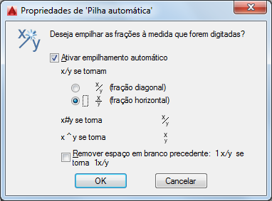 Empilha automaticamente caracteres numéricos digitados antes e depois dos caracteres de acento circunflexo, barra ou símbolo de libra. Por exemplo, se você digitar 1#3 seguido de um caractere de espaço ou um caractere especial válido, o texto será empilhado automaticamente como uma fração diagonal.