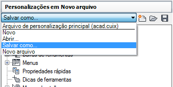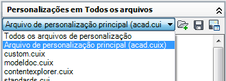 Todos os novos comandos criados são adicionados diretamente no arquivo CUIx de trabalho. Se o arquivo CUIx em que deseja trabalhar não está carregado, selecione Abrir a partir da lista suspensa Arquivos de personalização. A seguir, procure e selecione o arquivo CUIx com o qual deseja trabalhar.