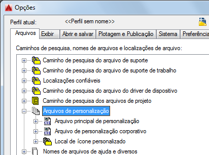 - Na caixa de diálogo Opções, guia Arquivos, clique no sinal de mais (+) ao lado de Arquivos de personalização, para expandir o nó.