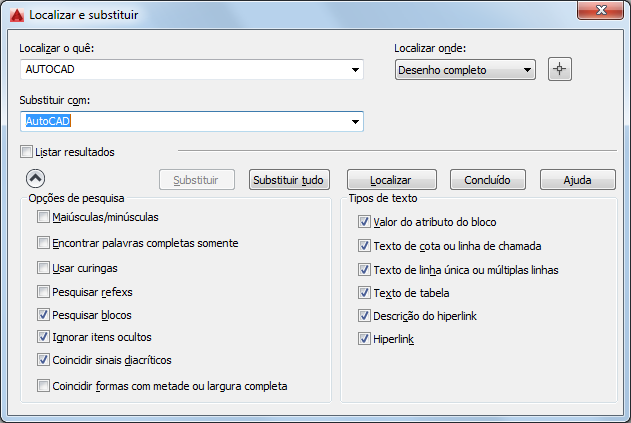 A configuração Localizar onde controla onde se deve encontrar e substituir texto em todo o desenho, texto no objeto ou objetos no momento selecionados.