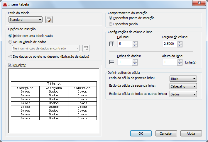 Especifica o local do canto superior esquerdo da tabela. É possível utilizar o dispositivo apontador ou inserir valores de coordenadas no prompt do comando. Se o estilo da tabela define a direção da tabela para leitura de baixo para cima, o ponto de inserção será no canto inferior esquerdo da tabela.