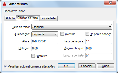 Configura as propriedades que definem a forma como o texto de um atributo é exibido no desenho. Altere a cor do texto do atributo na guia Propriedades.