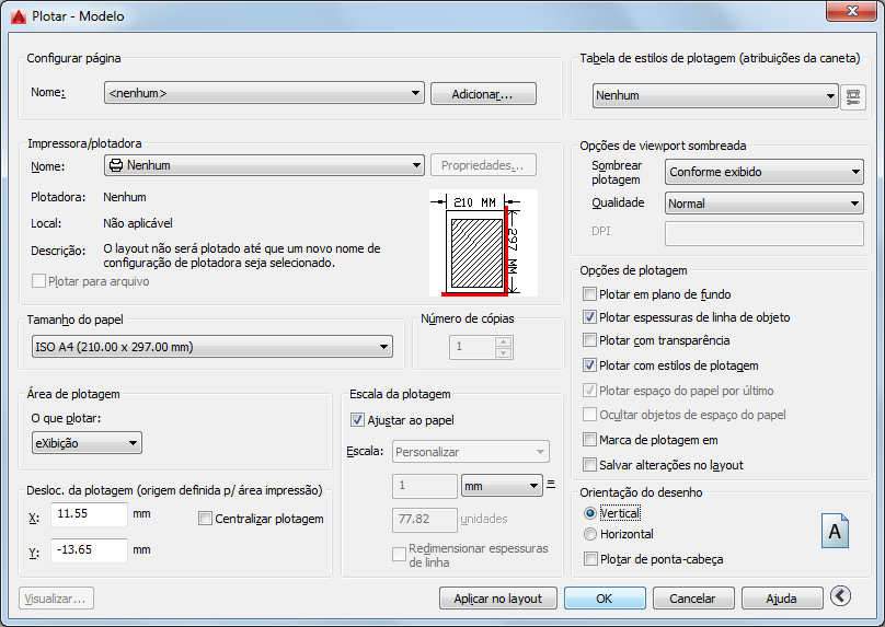 Se a plotadora selecionada não suporta o tamanho de papel selecionado do layout, um alerta será exibido e o tamanho de papel padrão da plotadora poderá ser selecionado, bem como um tamanho personalizado de papel.