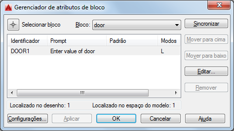 Os atributos do bloco selecionado são exibidos na lista de atributos. Por padrão, as propriedades de atributos Identificador, Prompt, Padrão, Modo e Anotativo, são exibidas na lista de atributos. Será fornecido para cada bloco selecionado uma descrição abaixo da lista de atributos que identifica o número de suas ocorrências no desenho e no layout atuais.