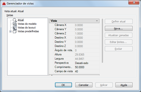 Para vistas de modelo e layout, exibe a posição atual da câmera.