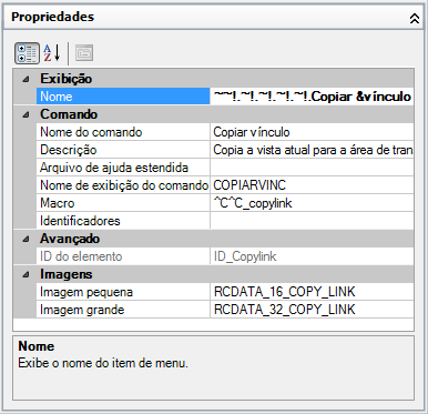 O acento til (~) e o ponto de exclamação seguido por um ponto final (!.) são colocados no início do rótulo do comando Copiar vínculo, na propriedade Nome, do painel Propriedades. O seguinte item é o resultado de Copiar vínculo, acinzentado e marcado, no menu Editar.