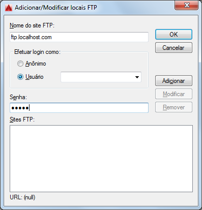 Para acessar a caixa de diálogo Adicionar/Modificar locais FTP, em uma caixa de diálogo padrão de seleção de arquivo, selecione Ferramentas Adicionar/Modificar locais FTP.