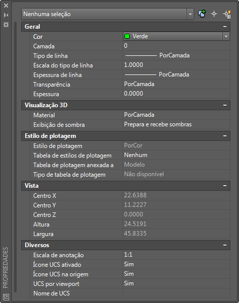 Se nenhum objeto estiver selecionado, as listas suspensas realçadas acima exibirão as configurações atuais para o desenho. Se você selecionar um objeto, as listas suspensas exibirão as configurações de propriedades do objeto.