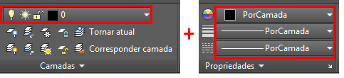 Na guia Início da faixa de opções, utilize as camadas e painéis de propriedades para verificar ou alterar as configurações para as propriedades mais comumente acessadas: camada, cor, espessura de linha e tipo de linha.