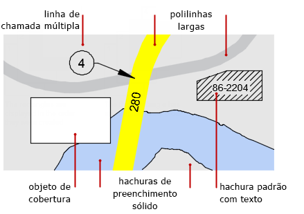 Você pode controlar objetos sobrepostos que abrangem uma área, como objetos com espessuras de linhas, polilinhas largas, hachuras e preenchimentos, anotação e imagens. Por exemplo, o seguinte mapa inclui vários tipos de objetos sobrepostos diferentes. Obviamente, a ordem na qual os objetos são exibidos e plotados é importante.