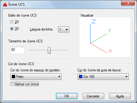 Controla as cores do ícone UCS nas viewports do espaço do modelo e nas guias de layout.