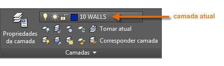O Gerenciador de propriedades de camada ocupa muito espaço e nem sempre você precisa acessar todas as opções. Para obter acesso rápido aos controles de camada mais comuns, utilize os controles na faixa de opções. Quando nenhum objeto é selecionado, o painel Camadas, na guia Início, exibe o nome da camada atual, como mostrado aqui.