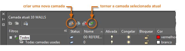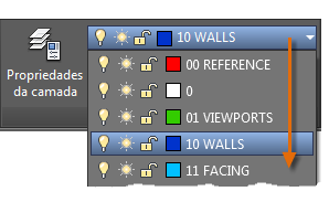 Para ver como um desenho é organizado, utilize o comando CAMADA para abrir o Gerenciador de propriedades de camada. É possível inserir CAMADA ou CA na janela Comando, ou é possível clicar na ferramenta Propriedades da camada, na faixa de opções.
