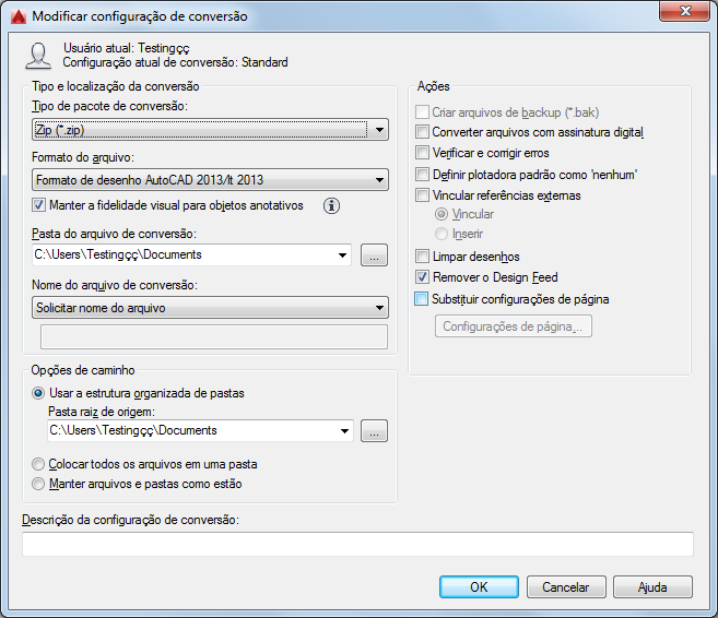 Insira uma descrição para a configuração de conversão. Esta descrição é exibida na caixa de diálogo Conversão DWG e na caixa de diálogo Configurações de conversão, abaixo da lista de configurações de arquivos de conversão. Você pode selecionar qualquer configuração de conversão na lista para exibir sua descrição.