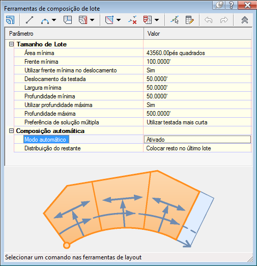 Você pode utilizar os parâmetros adicionais, como deslocamento de testada, largura e profundidade mínimas para uma precisão ainda melhor quando você inicialmente fizer o layout dos lotes. Os parâmetros de dimensionamento de lote permitem um fluxo de trabalho contínuo. Se você rejeitar uma solução proposta, você poderá simplesmente ajustar os parâmetros e os gráficos de visualização serão atualizados dinamicamente.