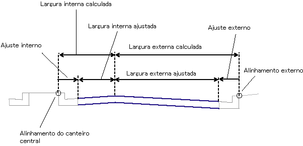 Ajustes internos e externos: Os parâmetros Ajuste interno e Ajuste externo são fornecidos no caso em que os alinhamentos usados para as bordas internas ou externas estejam em um deslocamento fixo da margem da pista de rolamento real. Por exemplo, o alinhamento que estiver sendo usado para a margem do canteiro central pode estar na parte posterior do meio fio em vez de na margem do pavimento. Neste caso, o parâmetro Ajuste interno deverá estar definido para a largura do meio-fio.