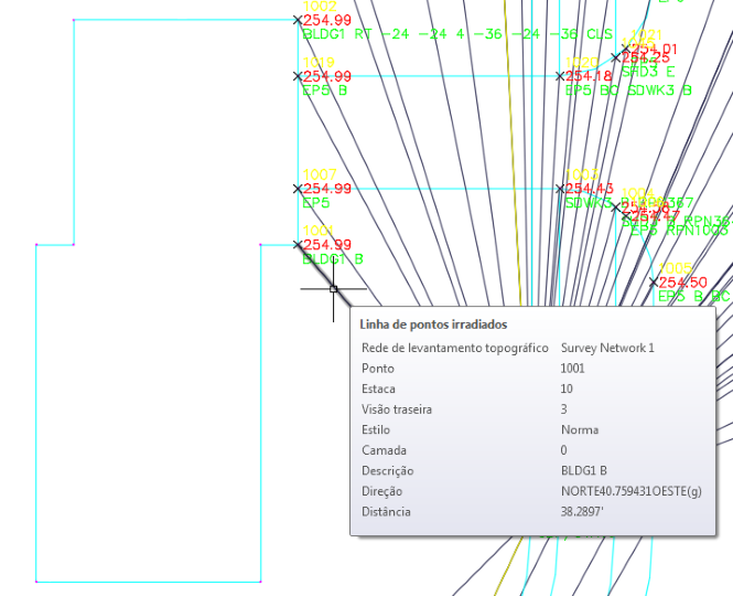 Levantamento topográfico para ver alguns dos dados importados do arquivo da caderneta de campo.