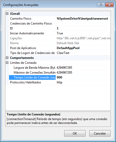 Por padrão, o tempo de espera de conexão IIS é 120 segundos. A duração do tempo de espera preferido para o servidor do Vault da Autodesk é 900 segundos. Se esta condição requer ação, aumente a duração do tempo de espera para o IIS.