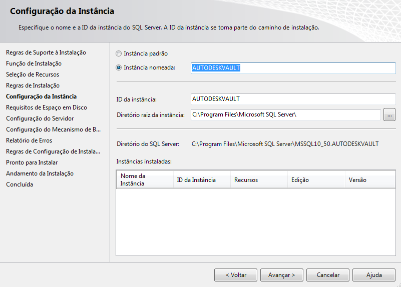 - Na janela Configuração de instância, selecione Instância nomeada e insira o nome AutodeskVault.