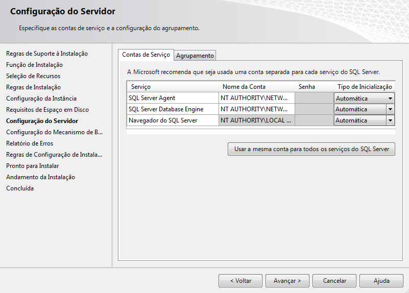 - Especifique a conta NT AUTHORITY\NETWORK SERVICE do mecanismo de banco de dados do SQL Server. A conta do sistema também é aceitável. Se você planeja executar o backup e restaurar para localizações remotas, especifique uma conta de domínio de usuário. Defina o tipo de inicialização como automático.