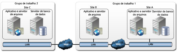 Um grupo de trabalho conectado é uma configuração de armazenamentos de arquivos que foram replicados de um site para outro e são gerenciados pelo banco de dados do Microsoft SQL. A ilustração a seguir mostra uma configuração típica de grupo de trabalho. Todos os locais em um único grupo de trabalho compartilham o mesmo servidor Microsoft SQL.