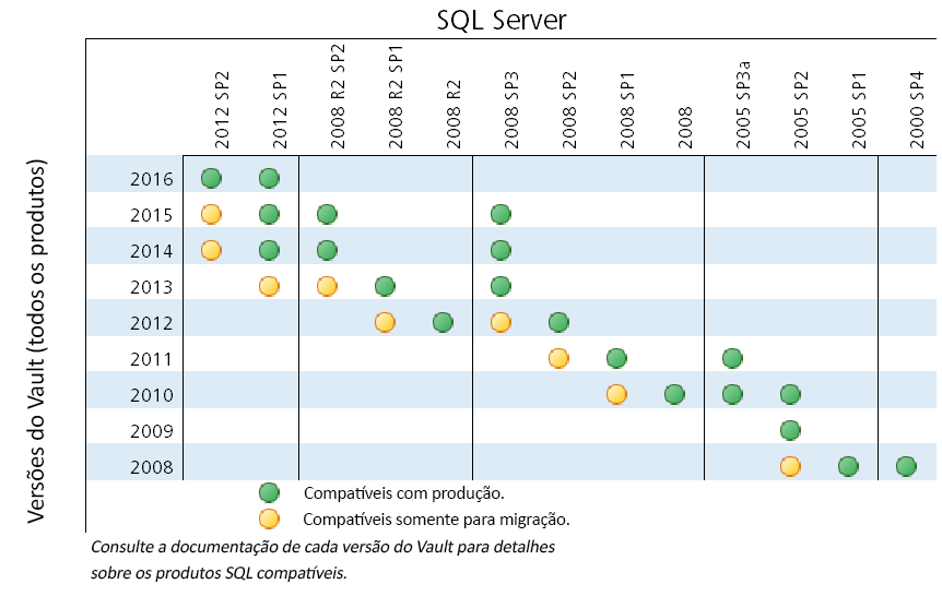A tabela a seguir resume as versões compatíveis do Vault e do SQL com pontos verdes. Os pontos amarelos são o caminho de atualização recomendado. Consulte os requisitos do sistema para sua versão do Vault a fim de garantir a compatibilidade entre as edições dos produtos Vault e SQL.