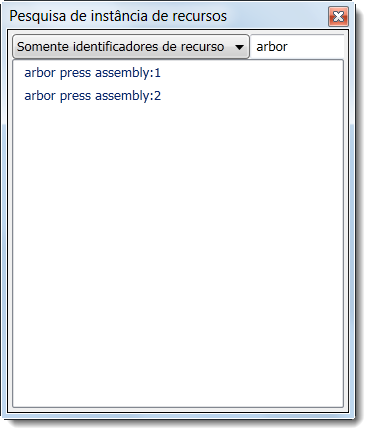 Pesquisar no painel Componentes do Factory na faixa de opções do Factory. A caixa de diálogo Instância de recursos de pesquisa é exibida.