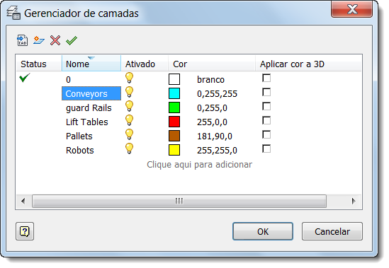 Com camadas, é possível criar, renomear, ativar/desativar a visibilidade, atribuir cores e excluir camadas de seus recursos 3D no layout do Inventor Factory usando uma caixa de diálogo. As camadas também podem ser importadas a partir de um DWG existente.
