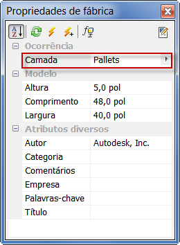 - Selecione um ou mais recursos do layout de piso de fábrica. Mantenha pressionada a tecla Ctrl ou Shift para seleção múltipla. O nome da camada do recurso selecionado aparece na parte superior do Navegador de propriedades de fábrica. Se forem selecionados múltiplos recursos em diferentes camadas, o nome da camada será exibido como *Multivalores*.
