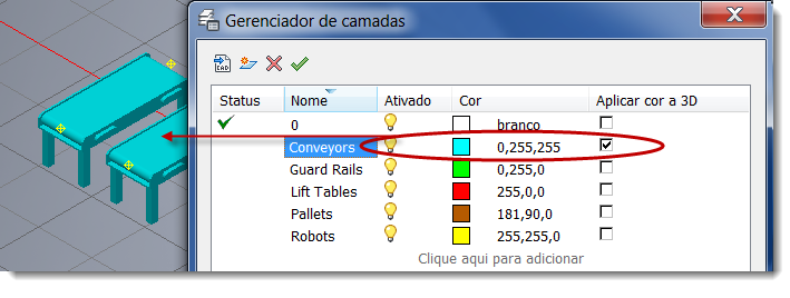 Nota: Lembre-se de que as cores das camadas somente aparecem no AutoCAD Factory após o uso do comando Sincronizar AutoCAD. Recursos brancos são exibidos em preto em um plano de fundo claro do AutoCAD e em branco em um plano de fundo escuro.
